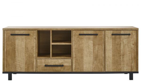 Modern dressoir met een strak uiterlijk. De mooie kleur old teak en het gepoedercoate zwart metalen frame geven je interieur een unieke sfeer.