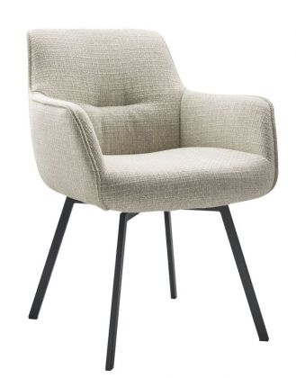 Turelli is een stijlvolle en comfortabele armstoel. Deze stoel is afgewerkt met een vlindernaad en bekleed met een luxe gemêleerde weefstof in de kleur beige met lichtgrijze kleurnuances. De stof heeft een wat grovere structuur en voelt zacht aan. Het teruggetrokken stiksel in de rugleuning en de zwart metalen poten geven de stoel een stoer accent.