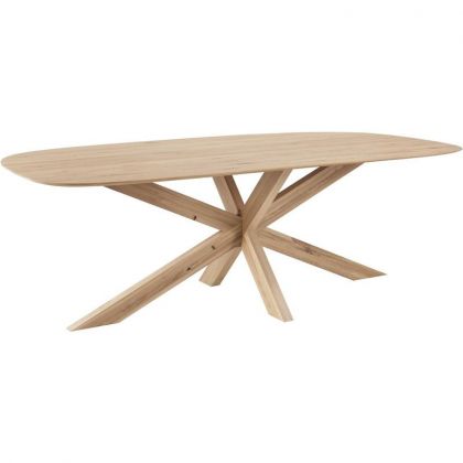 Geef je eethoek een stoere look met organische eettafel Selectio, uitgevoerd met een organisch blad en verjongde rand in eiken kleur basic E017, gecombineerd met een houten spinpoot.