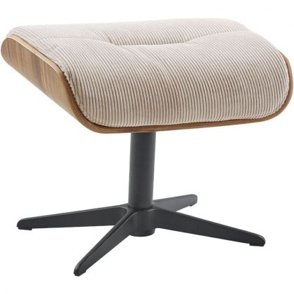 Deze hocker is uitgevoerd in een beige stof met sierstiksel, een noten geoliede schaal en met een zwart metalen 5-teensvoet, wat de hocker een elegante uitstraling geeft. De hocker hoort bij draaifauteuil Hintas, en geeft zo extra comfort.