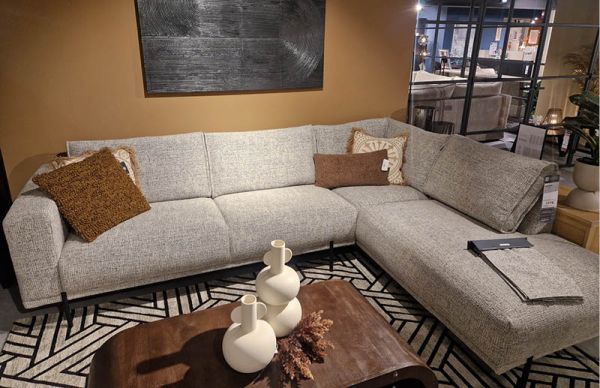 Hoekbank Druentio bestaat uit een 3-zits arm links + hoek met eiland groot rechts en is uitgevoerd in stof coco 83 met zwarte metalen poten.