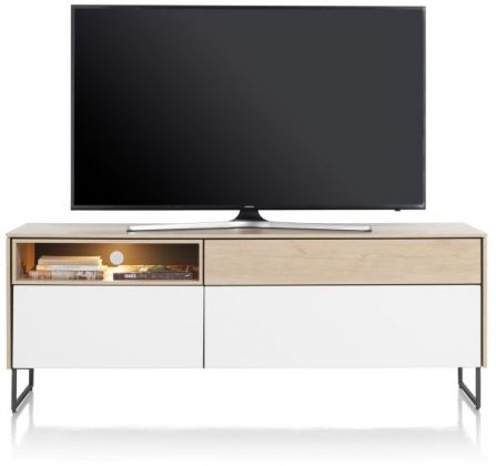 Lowboard Lindfield - 160 is gemaakt van HPL in de kleur wit en eikenlook en heeft een grijs metalen onderstel. Dit lowboard heeft 3 laden + 1 niche + LED verlichting.