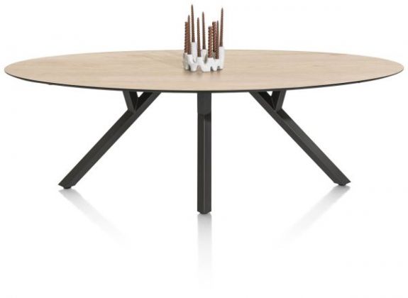 Eettafel Minato - 240 heeft een bovenblad van HPL in de kleur eiken naturel. Deze eettafel heeft een zwart metalen onderstel.