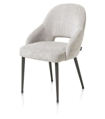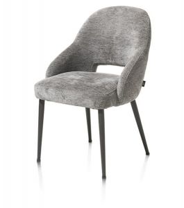 Eetstoel Nikolas is bekleed met stof Enzo in de kleur kiezel en heeft 4 vaste poten van metaal in de kleur grafiet.