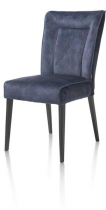 Eetstoel Olivera is bekleed met stof in de kleur blauw en heeft zwarte houten poten.