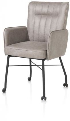 Deze moderne eetkamerstoel met armleuningen heet Olvi. De stoel heeft een fris eigentijds design, met een subtiele retro toets dankzij de stiknaden op de rugleuning. De eetkamerstoel staat op zwart metalen poten, voorzien van wielen. Op de achterkant van de rugleuning zit een handige greep. Olvi is bekleed met microleder Nevada in de kleur liver, een bekleding die uit een mix bestaat van een microvezelstof met ledervlokken. De eetkamerstoel is in meerdere stoffen, ledersoorten en kleuren verkrijgbaar, maar dit is een voorraadvariant die meestal meteen beschikbaar is! Daarnaast is er ook een variant zonder armleuningen.