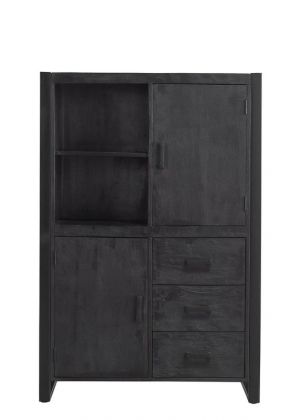De bergkast heeft een stoer en veelzijdig karakter, de kleur is zwart met een zwart metalen frame. De kast heeft 2 deuren, 3 laden en 2 open vakken. De kast is voorgemonteerd. Bergkast Newhaven is onderdeel van het woonprogramma Newhaven. Combineer de bergkast met de andere meubelen uit het woonprogramma voor een mooi geheel in je interieur.