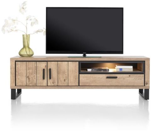 Tv-dressoir Pavarotti 180 cm is uitgevoerd in HPL in de kleur barnwood, in combinatie met zwarte metalen poten. Het dressoir is voorzien van 2 deuren, 1 lade en 1 niche met LED verlichting. De deuren en lade zijn softclosing.