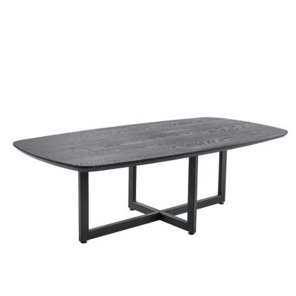 De combinatie van het zwart gelakte blad met de zwarte metalen gekruiste U-poten geeft deze salontafel een chique en verfijnde uitstraling.
