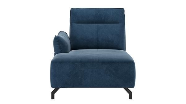 Longchair Valletta - links is bekleed met stof in de kleur blauw en heeft zwart metalen poten.