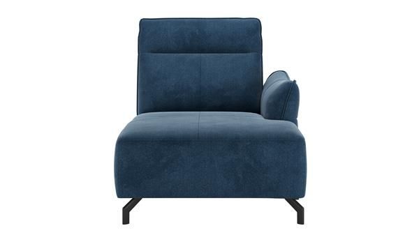 Longchair Valletta - rechts is bekleed met stof in de kleur blauw en heeft zwart metalen poten.